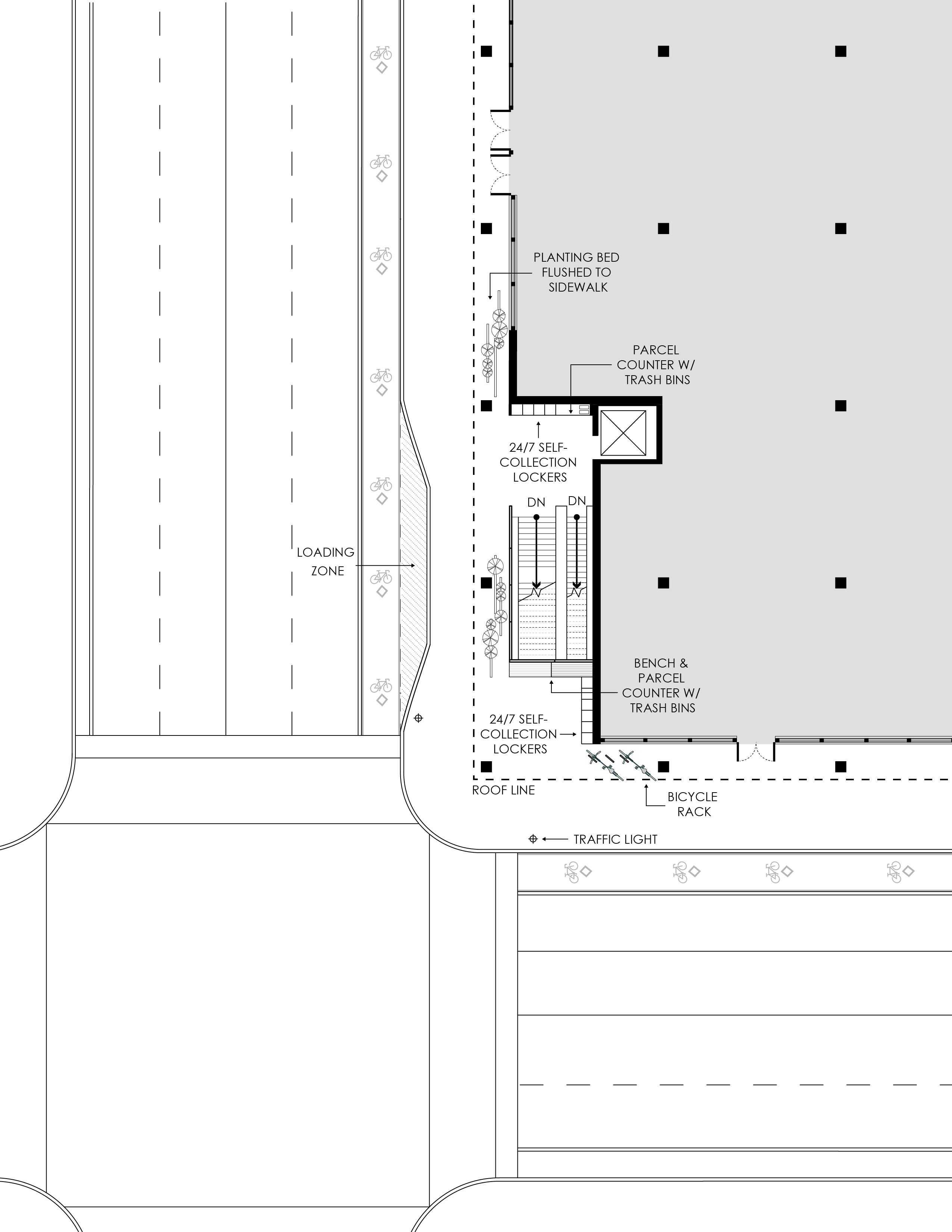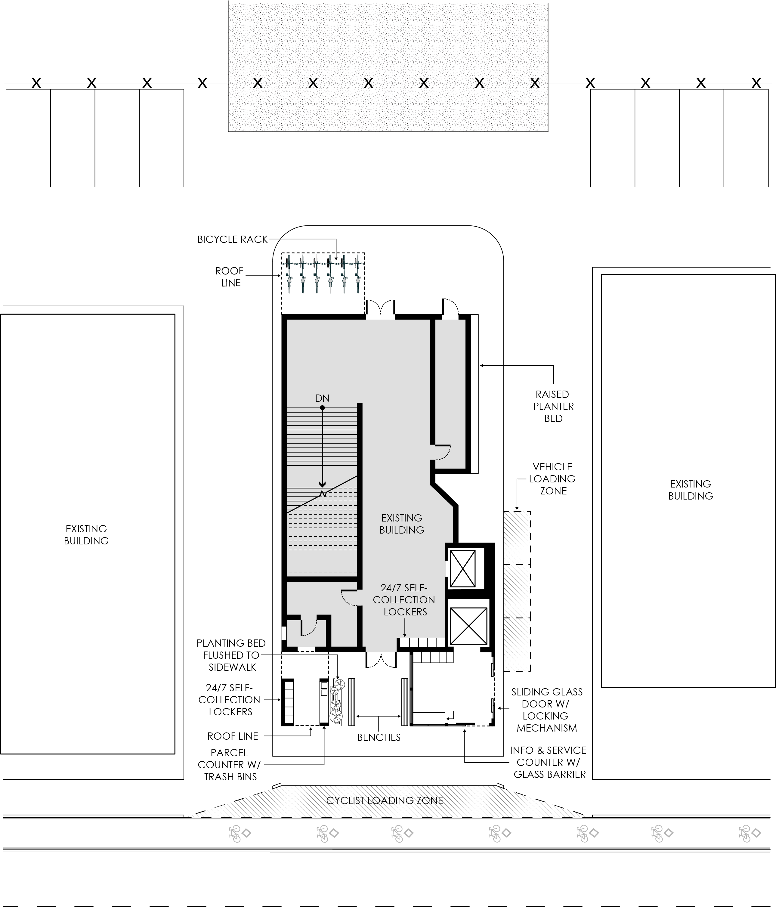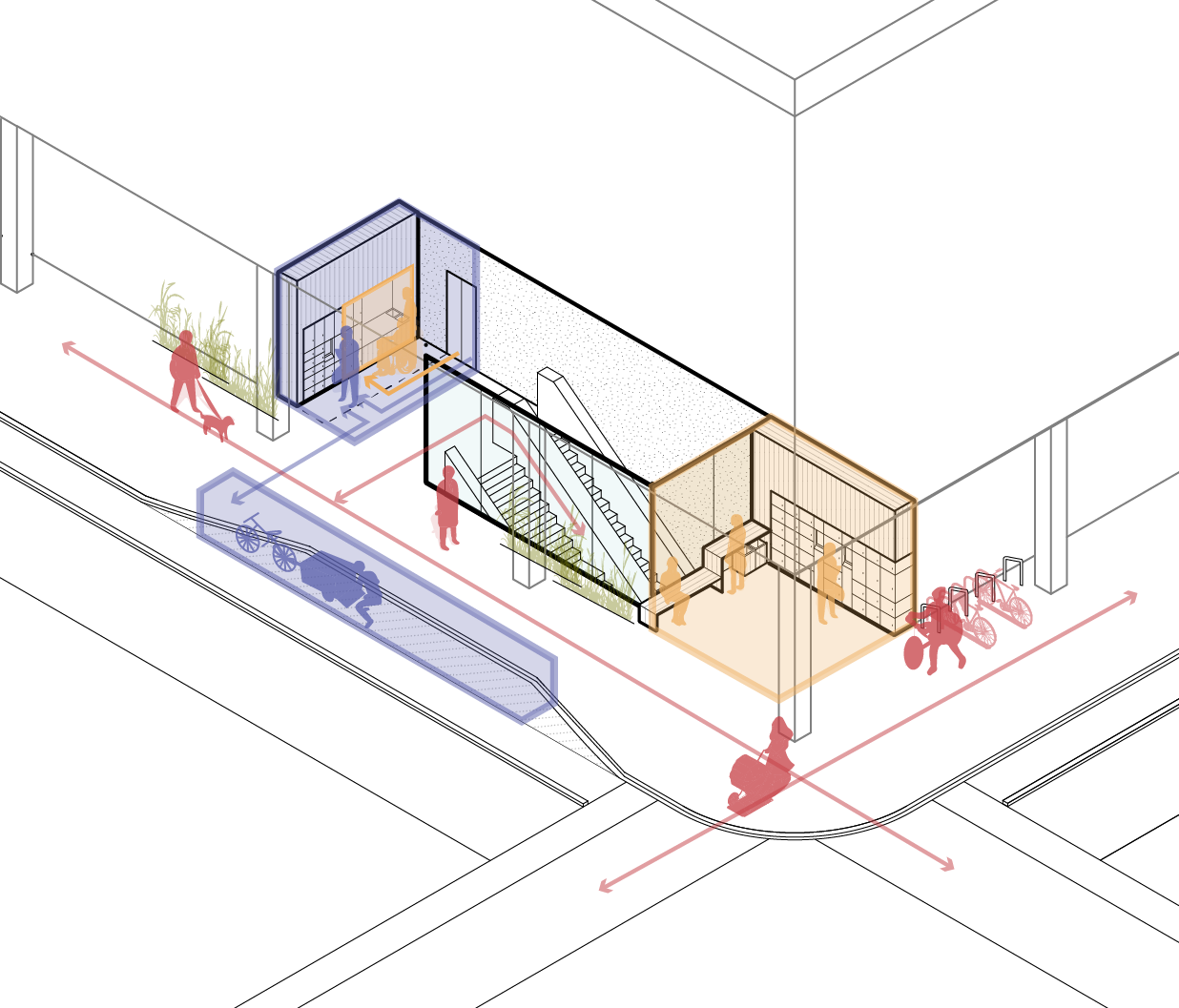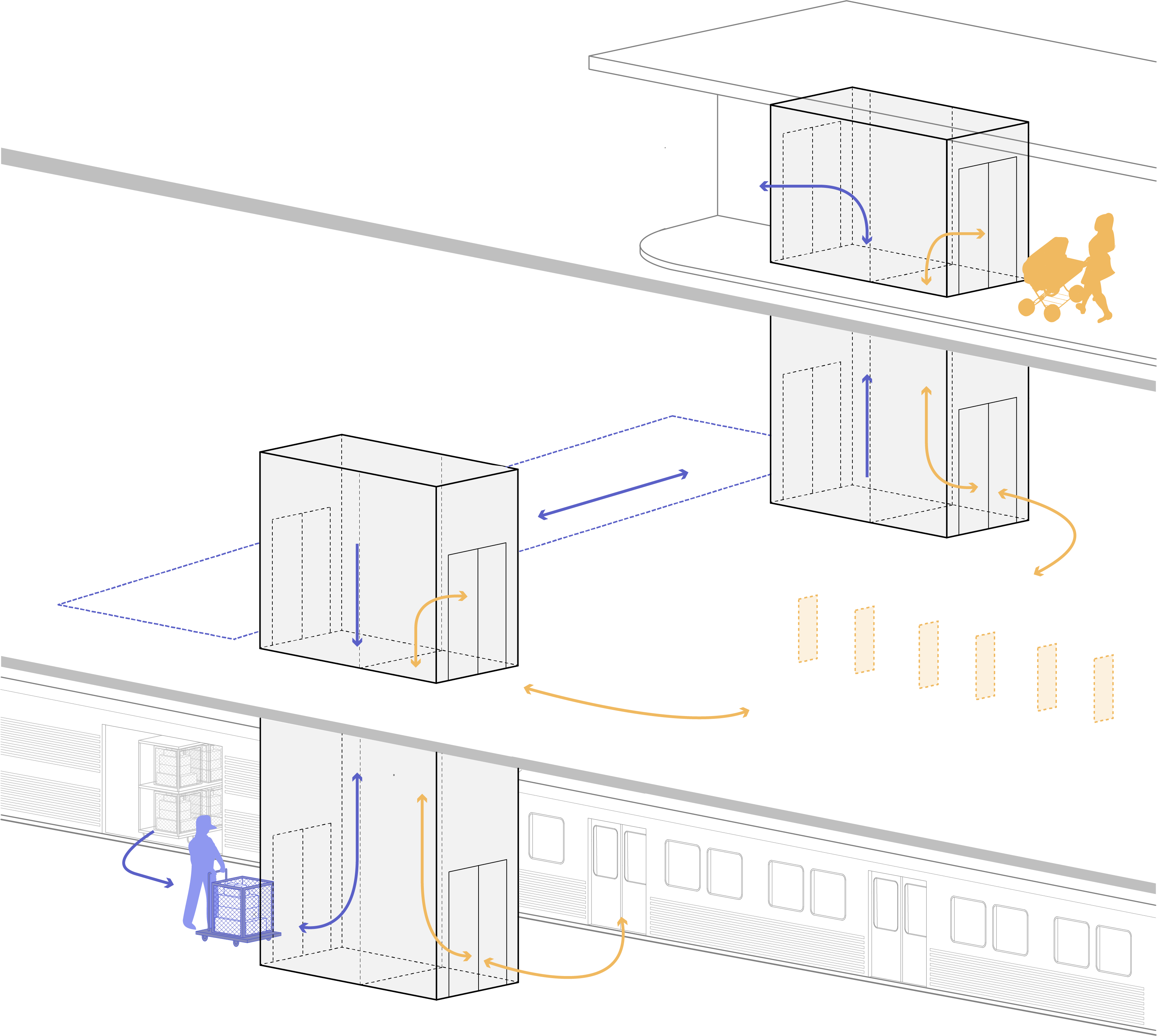 The architectural intervention proposed occurs in the subway stations where parcels have reached their destination. While this proposal implements elevators for freight delivery using the TTC, this is also an opportunity to integrate accessibility on subway stations. Currently, Toronto is reconstructing to make all their stations accessible by 2025. This thesis proposes to include accessibility and infrastructure for parcel collection to alleviate both ‘last mile problems,’ and encourage ridership for all. Every subway station in Toronto is unique, and so this is a general concept for how parcel distribution and accessibility can be implemented.