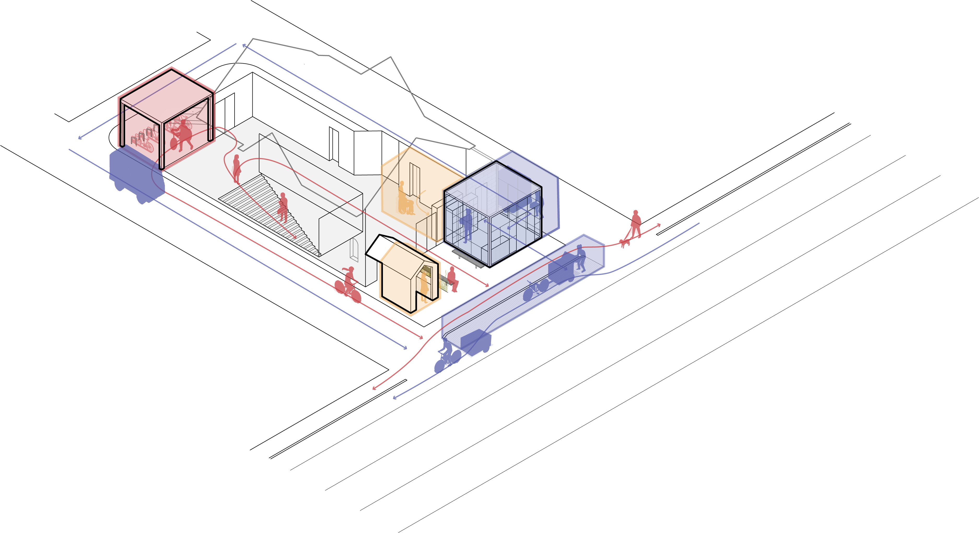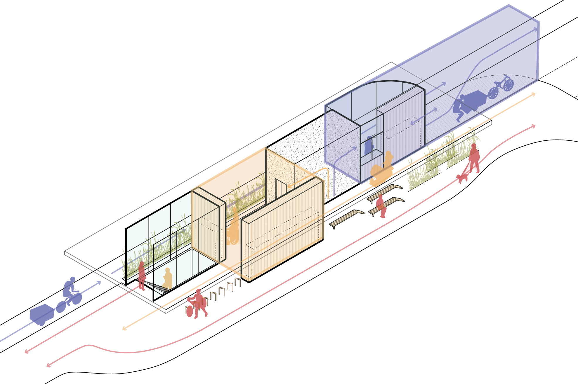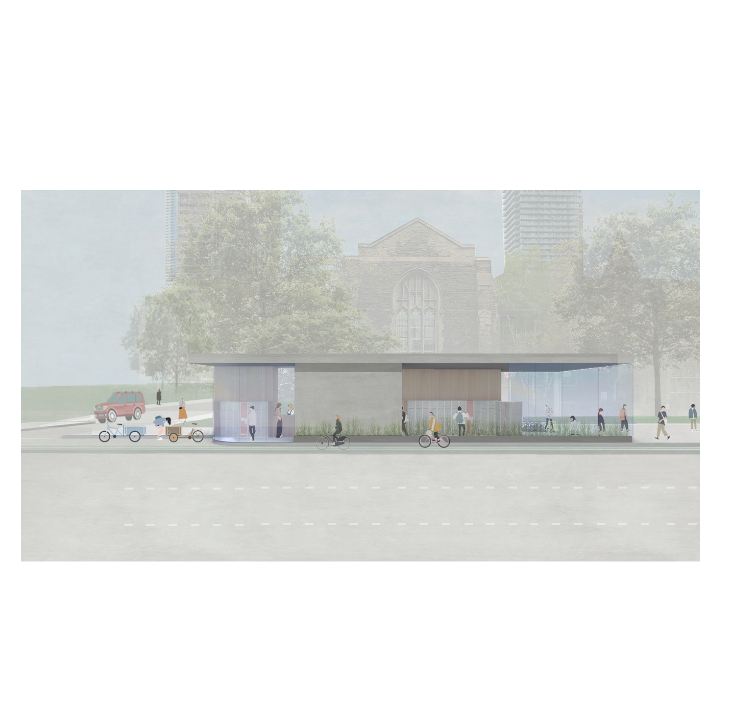 Rethinking Toronto’s Last Mile is an architectural intervention regarding Toronto’s current and unsustainable model for city logistics. This proposal hopes to create a community space that integrates three novel methods of urban freight movement into the city’s existing transportation infrastructure. The system introduced to Toronto’s framework is based on co-modality, “integrating passenger and freight transport systems”1 as an “efficient use of different modes on their own and in combination.”2 By designing a relationship between methods of freight on transit, micro-mobility delivery, and self-collection lockers; this thesis aims to create a comprehensive city freight movement that complements the daily activities in major locations of the downtown community- Toronto’s subway stations.