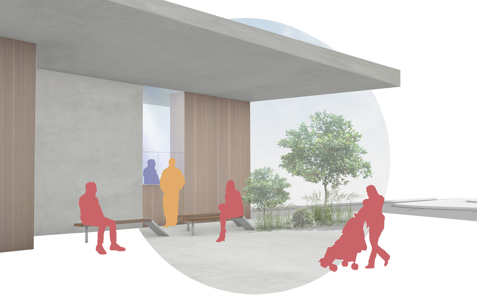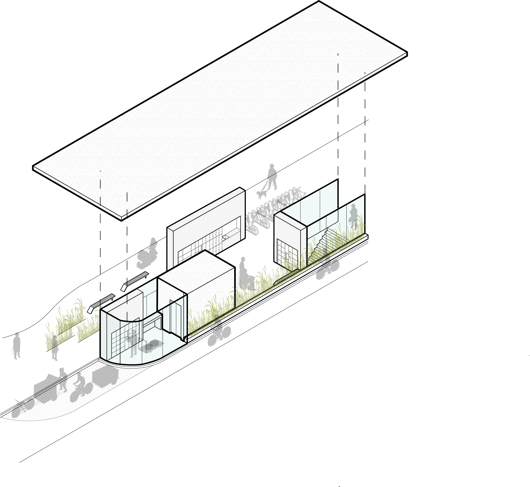 The concept behind the redesign for Museum station is in its materiality and form. The structural concrete elevator core ‘acts’ as if it is pushing up the sidewalk from underground, bringing what would normally be underground activity to the street level. Using materiality of a heavy concrete roof against frameless glass walls to portray that the roof is held up by the elevator core. Locker wall systems are then integrated into the shelter to create spaces and movement of people.